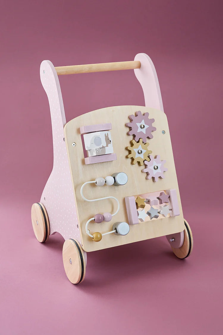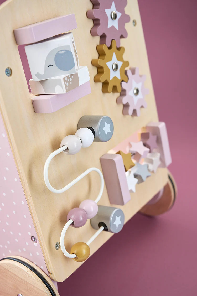 - Funcție 2-în-1: Nu este doar un ajutor la mers, ci și o jucărie completă. Vine încărcat cu un set de cuburi din lemn de diverse forme și culori pastelate, transformându-se într-un atelier mobil de construcții.