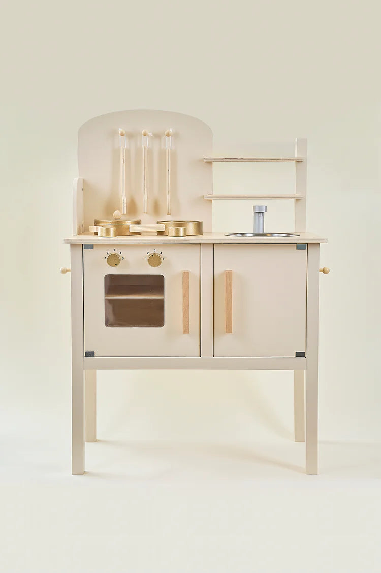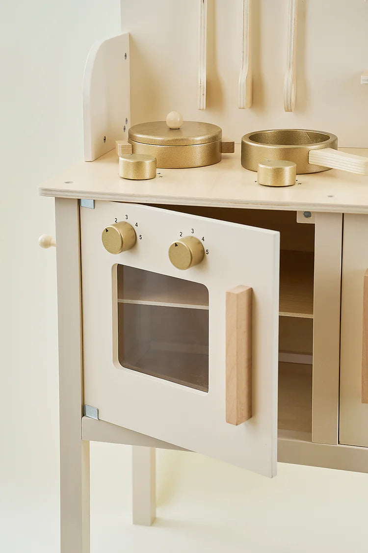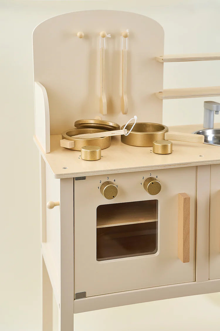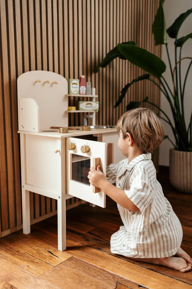 Micii maeștri bucătari sunt gata de acțiune! Această bucătărie de jucărie din lemn, cu un design scandinav elegant în nuanțe de crem și lemn natur, este visul oricărui copil.