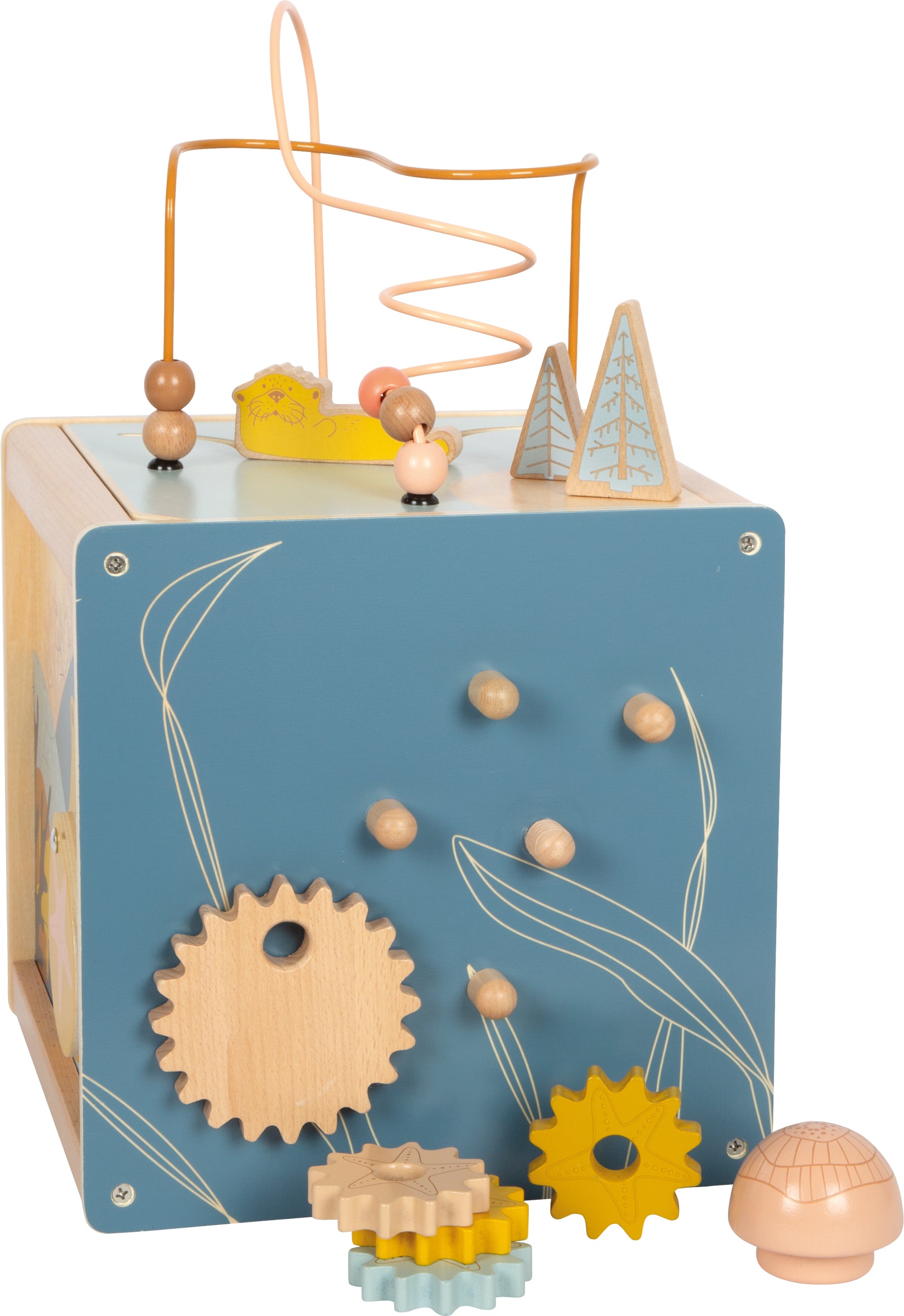 Un loc de joacă complet într-un singur cub Cubul "Seaside" de la Small Foot este un adevărat campion al diversității. Construcția robustă din lemn natur, combinată cu nuanțe moderne de albastru și culori pastelate, îl face irezistibil pentru micii exploratori.