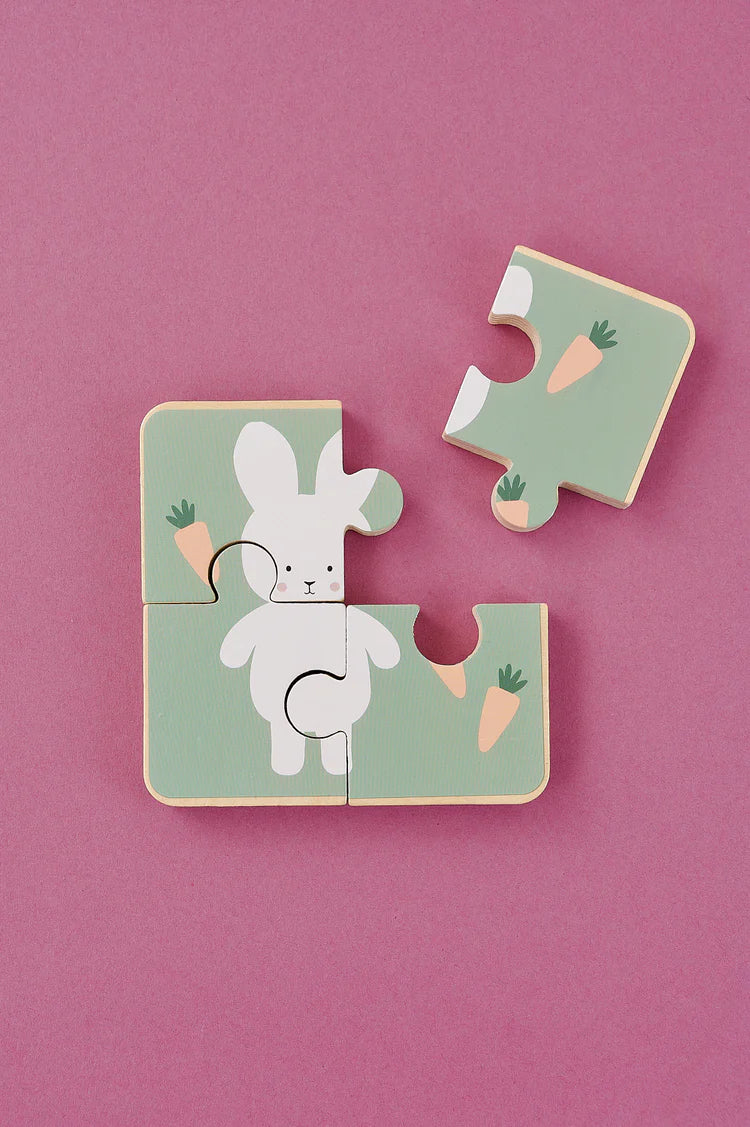 - Puzzle din lemn cu doua fete: Pe o parte, un puzzle colorat care incurajeaza creativitatea, iar pe cealalta, un puzzle cu iepuras pentru exersarea recunoasterii modelelor.
