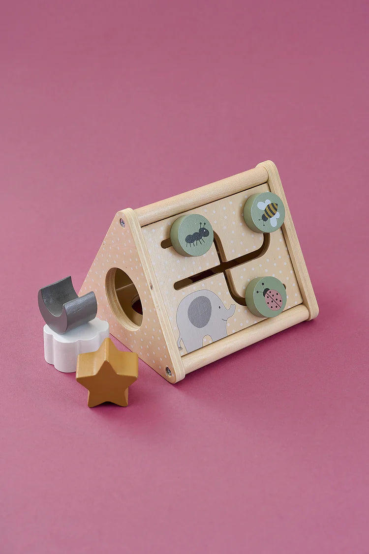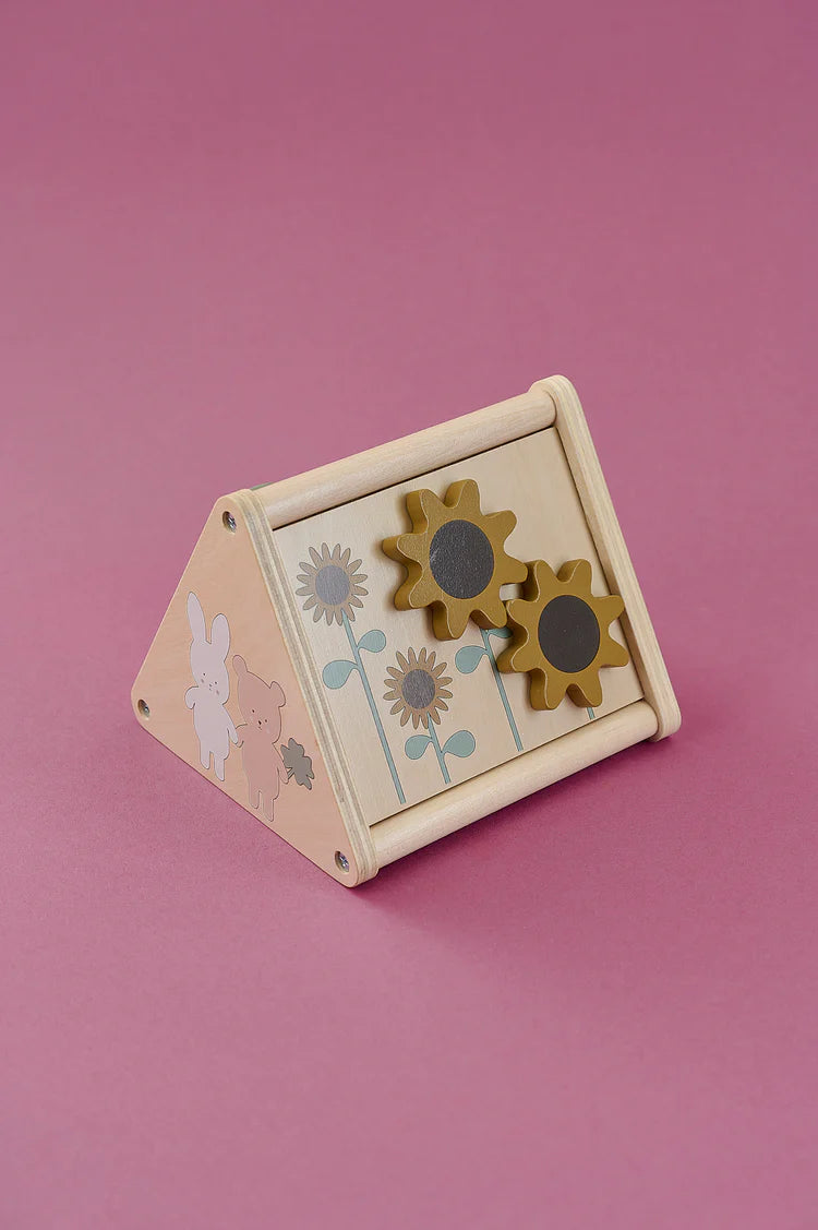 - Triunghi de activitati 3-in-1: O jucarie complexa cu roti dintate, insecte mobile si sortator de forme, care stimuleaza rezolvarea problemelor si gandirea logica.